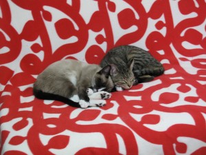 İlk aklımızı çelen Siyam kedisine benzeyen kedicik oldu. Hem siyam karizması hem de surat ve patisindeki beyaz lekelerden gelen şapşal ifade bizi tavladı. O kadar kormuştu ki tir tir titriyordu! Siyam kırması ile ilgilendiğimizi gören barınak yetkilisi, bu kediciğin çok ürkek olduğunu, kendini ancak kardeşi olan tekir kedicik yanında güvenli hissettiğini ve ikisini birlikte evlat edinmemizi önerdiğini söyledi. Tekir kedi almak hiç aklımızda yoktu, ama tekir olan kafes içinden bize o kadar şirin ve cin bir suratla baktı ki! Dayanamayıp ikisini de alıp eve getirdik…